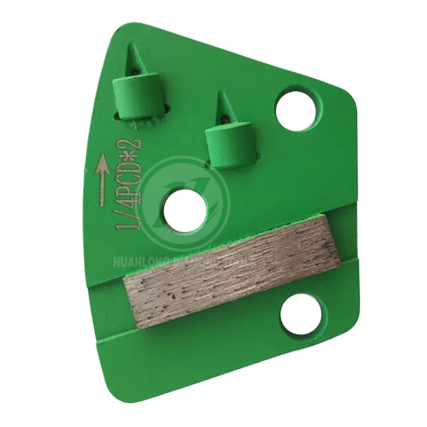 Bolt-on Style 3×1/2 PCD refers to a type of concrete floor grinding tool, specifically a diamond segment with 3 pieces of half-round Polycrystalline Diamond (PCD) on a plate metal blank, used for aggressively removing thick coatings like epoxy, glue, and mastic from concrete floors