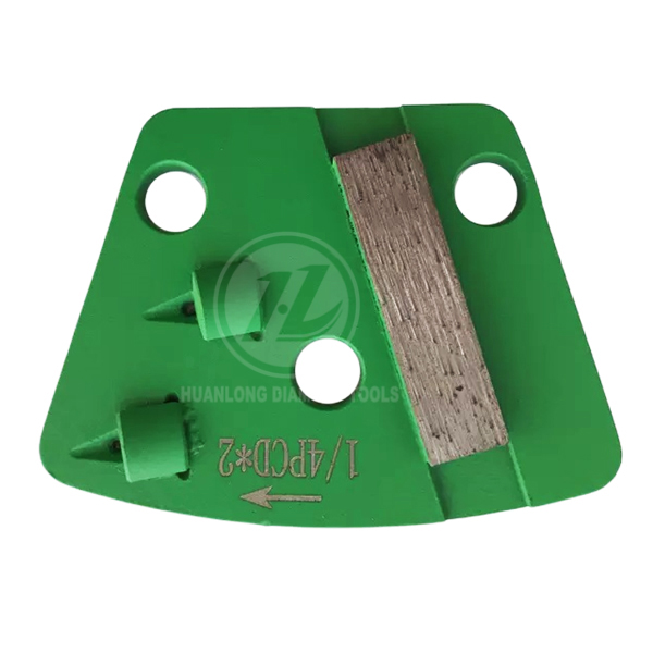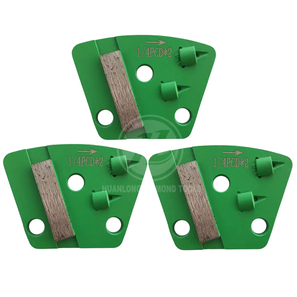b.PCD with double arrow or metal bond button are less aggressive, so they do not damage the concrete.The sacrificial bars or metal bond arrow act as a depth guide, and reduce the gauging of the floor cause by the aggressive PCD segments. Moreover, the metal bond will extend the life of PCD.